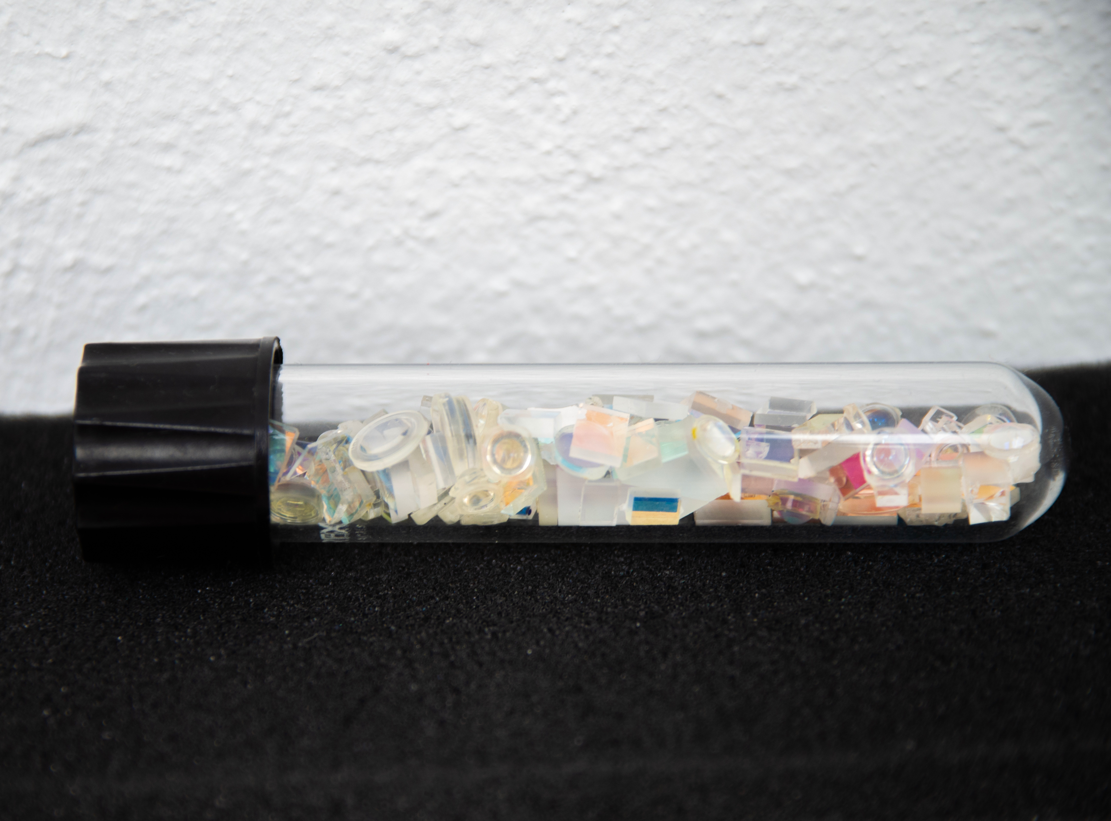 Tube en verre et lentilles laser. 15x13x10cm. 2018.